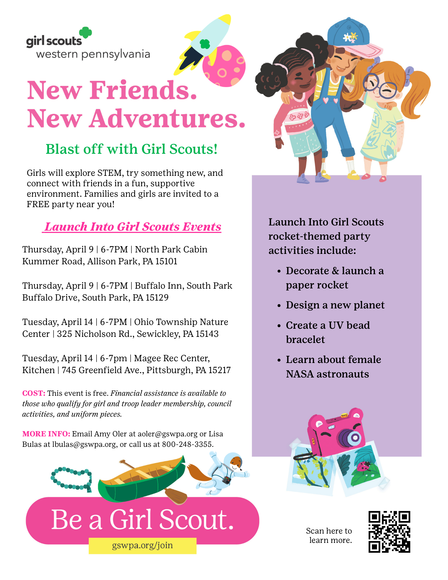 Blast off with Girl Scouts! Launch Into Girl Scouts rocket-themed party activities include: Decorate & launch a paper rocket Design a new planet Create a UV bead bracelet Learn about female NASA astronauts Girls will explore STEM, try something new, and connect with friends in a fun, supportive environment. Families and girls are invited to a […]